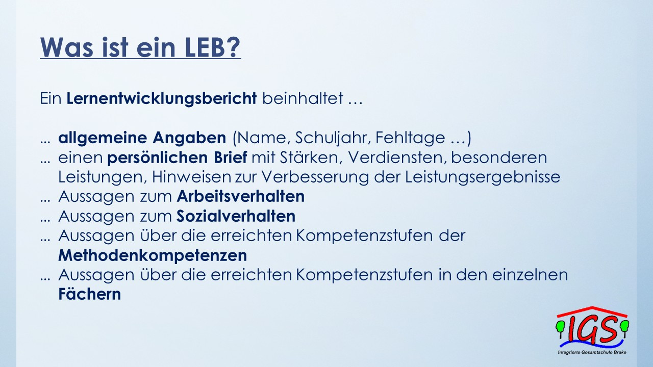 Außerdem können Sie sich einen beispielhaften Lernentwicklungsbericht anschauen.